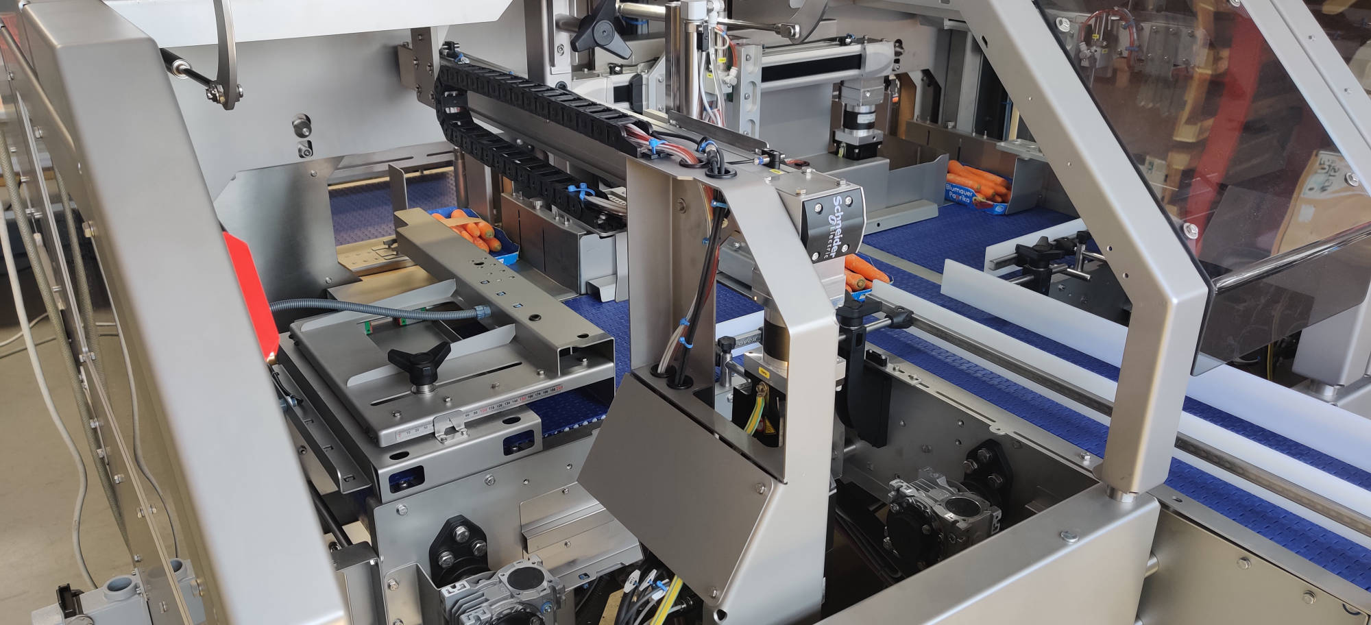 Die Trennung der Produkte erfolgt gemäß den verwendeten Banderoliereinheiten. Wenn eine der Banderoliereinheiten nicht verwendet wird, wird die Platzierung der Produkte entsprechend angepasst.